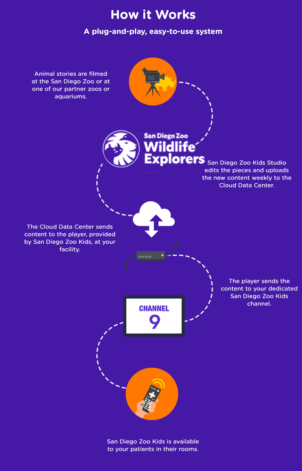 By watching San Diego Zoo Kids, patients can virtually experience the world of animals, zoos, and aquariums. It's an engaging activity that takes their mind off their condition for a while, allowing them to relax, sleep better—and heal. And that's what everyone wants—for kids to heal, be happy, and return home!